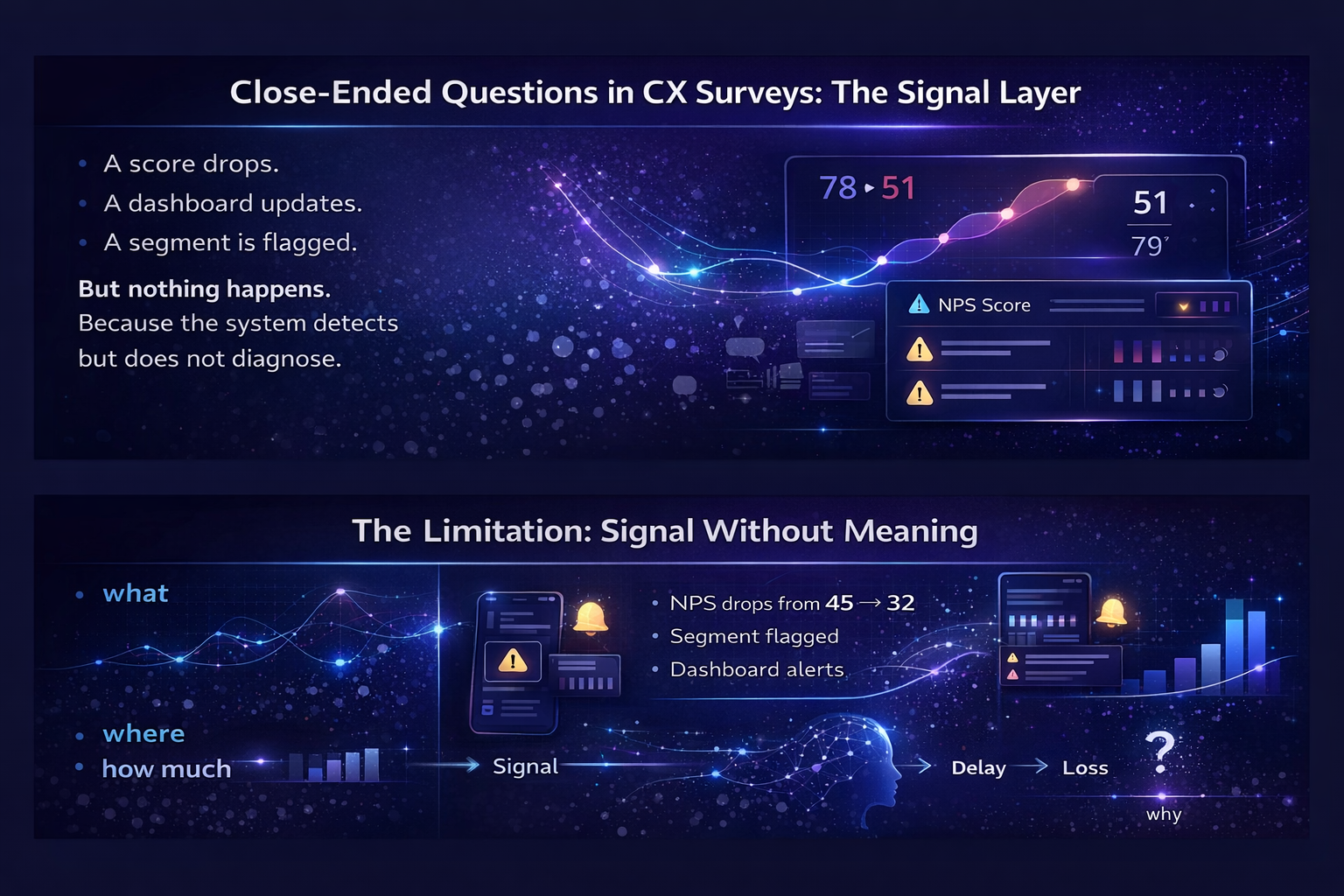 The most effective CX surveys combine both, using closed-ended for signal and open-ended for diagnosis, enabling real-time decision-making.