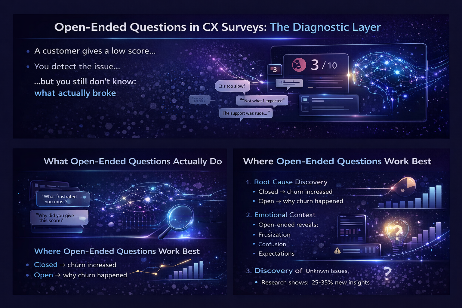 Open-ended questions allow customers to respond in their own words, helping uncover root causes, emotions, and deeper insights.