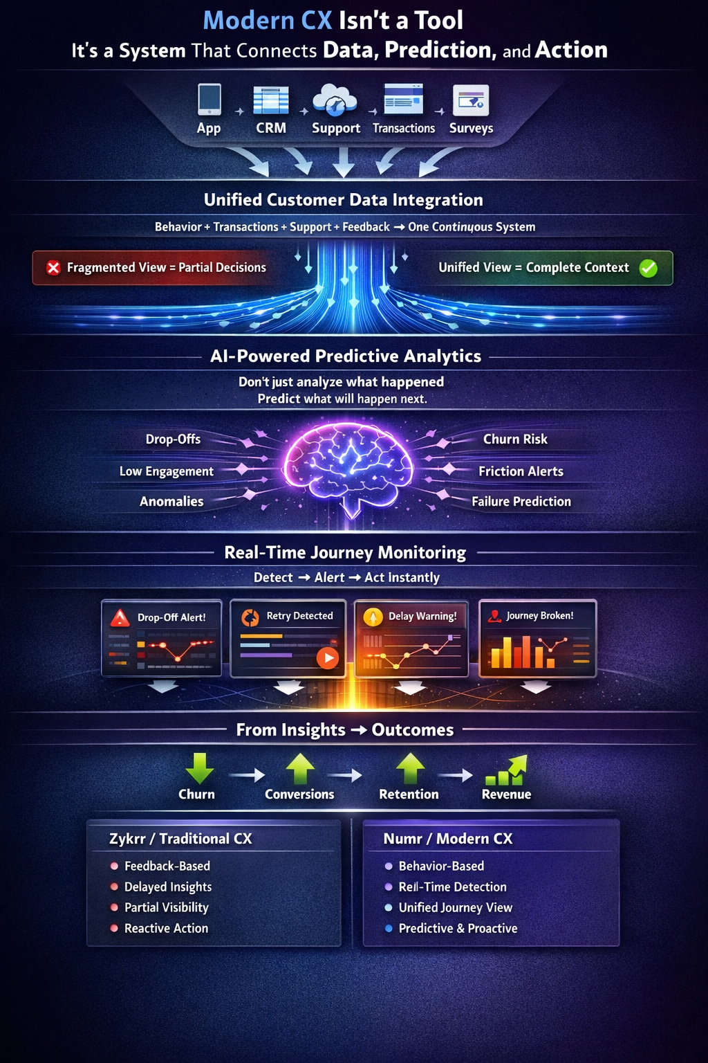 Zykrr captures customer feedback after the experience through surveys, reviews, and post-interaction insights. This creates a time gap between problem and action. Numr continuously monitors live customer journeys across touchpoints apps, call centers, transactions, and interactions. As soon as friction signals appear (like retries, drop-offs, or delays), the system detects them instantly, giving teams the ability to respond in real time instead of after the experience has already failed.