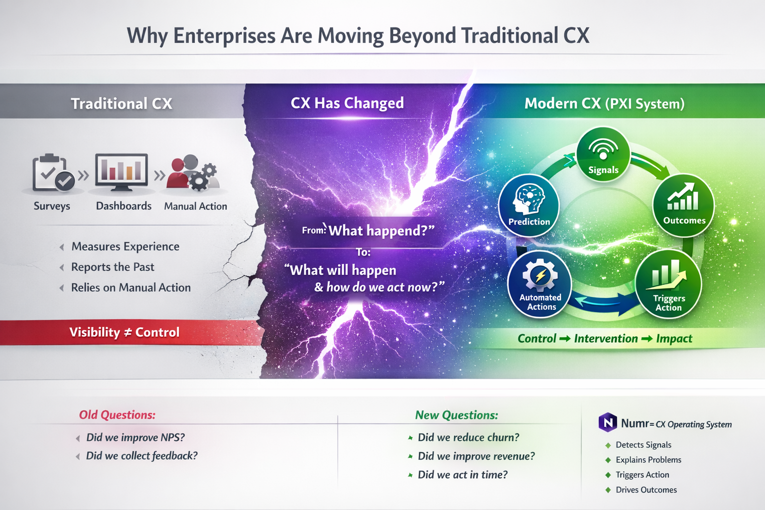 This isn’t just a tooling issue. It’s a structural problem in how CX is being handled. CX is being measured but not operationalised and that’s the core issue modern enterprises are trying to solve. This is where Predictive Experience Intelligence (PXI) changes the model. Instead of starting with surveys, PXI starts with customer behavior.