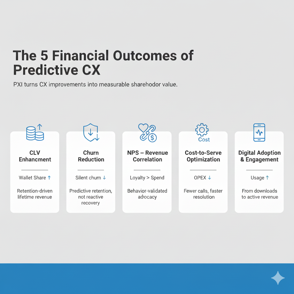 It connects NPS fluctuations with behavioral outcomes - like transaction volumes, app usage, and cross-sell activity. When NPS rises but transactions fall, PXI identifies the mismatch, ensuring banks measure real loyalty, not perceived satisfaction.