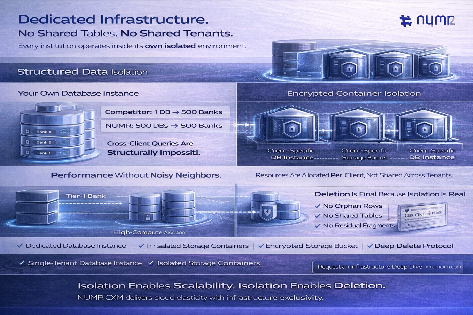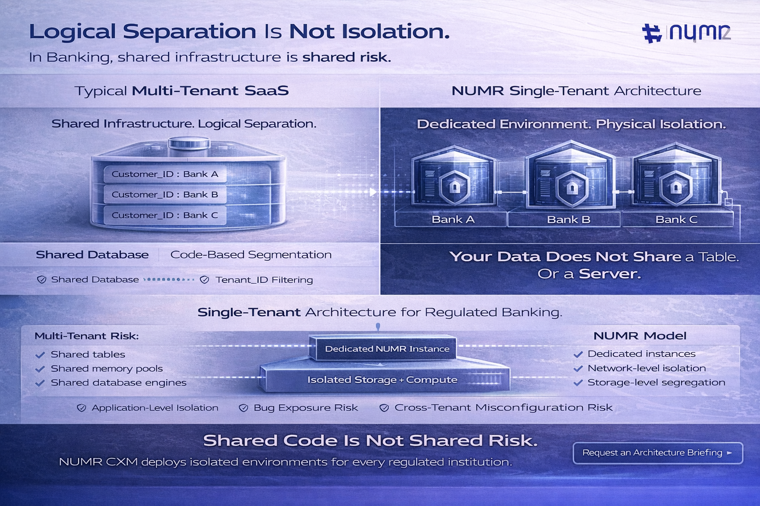 At NUMR CXM, we believe that "Logical Separation" is not enough for Financial Services. We built Physical Isolation into the bedrock of our platform.