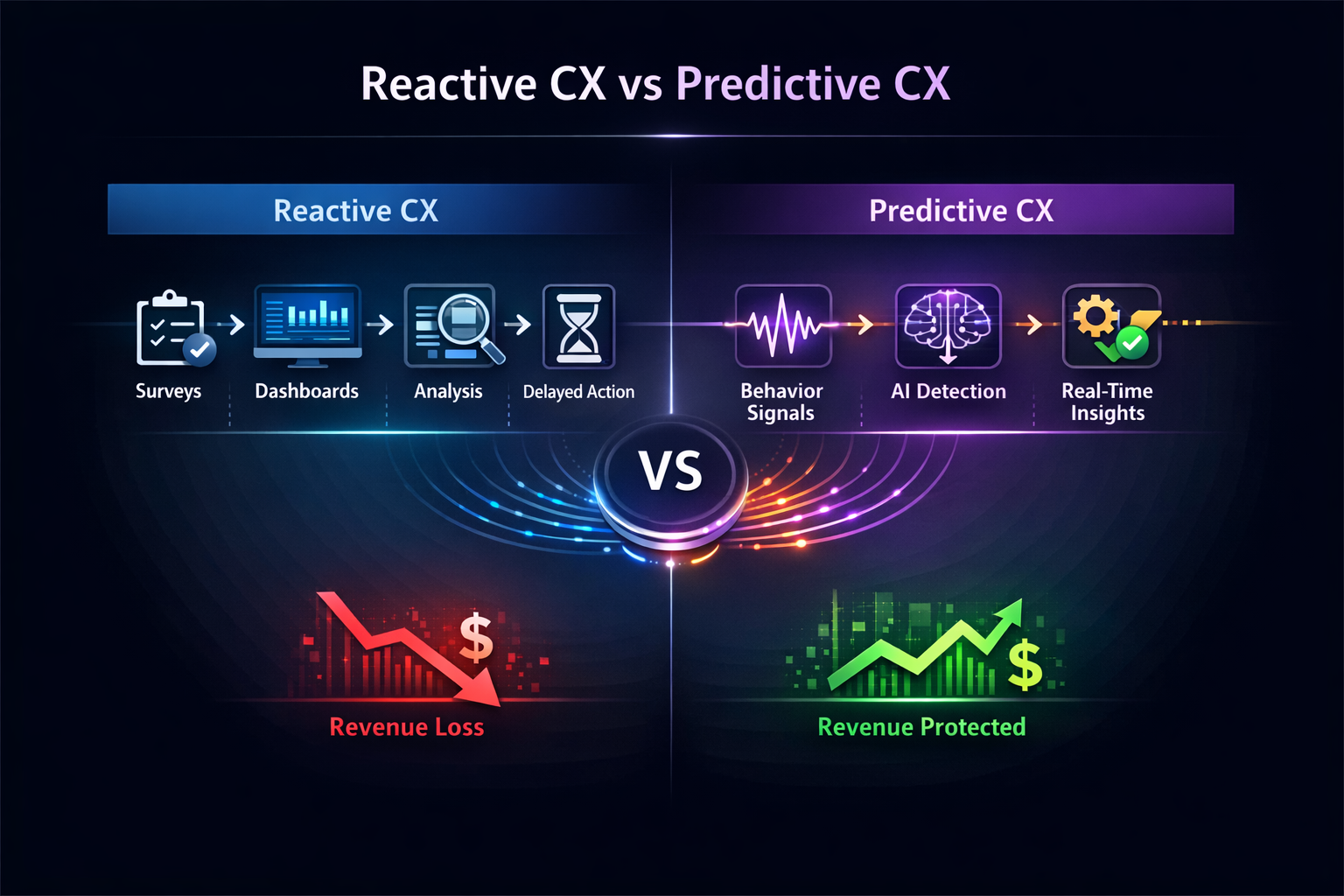 The key difference is timing and execution. Reactive CX looks at past events and responds after problems occur, while predictive CX detects risks in real time and enables proactive action before customer experience breaks down.