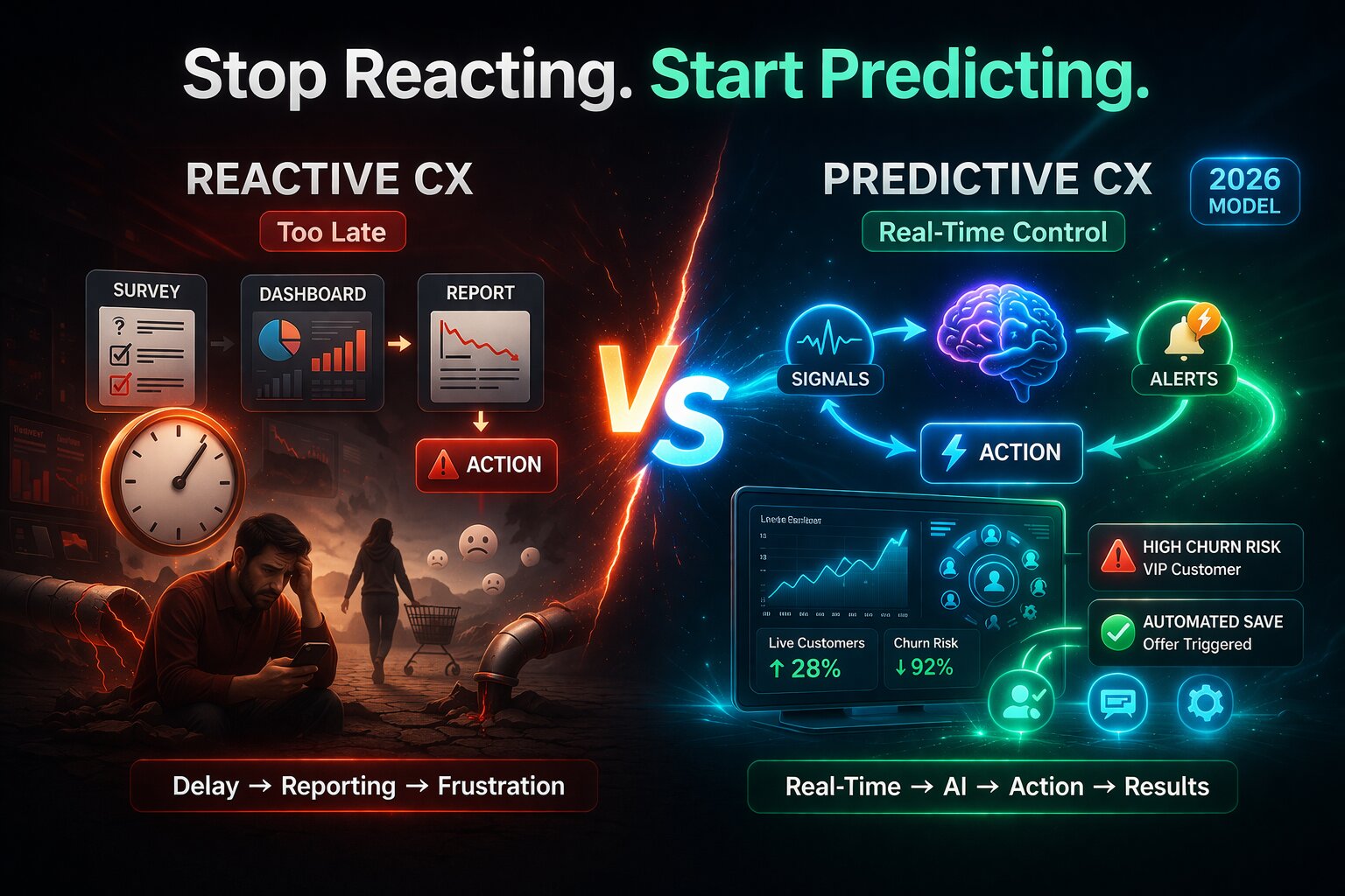 By now, you understand the shift. Reactive CX explains what happened. Predictive CX anticipates what will happen.