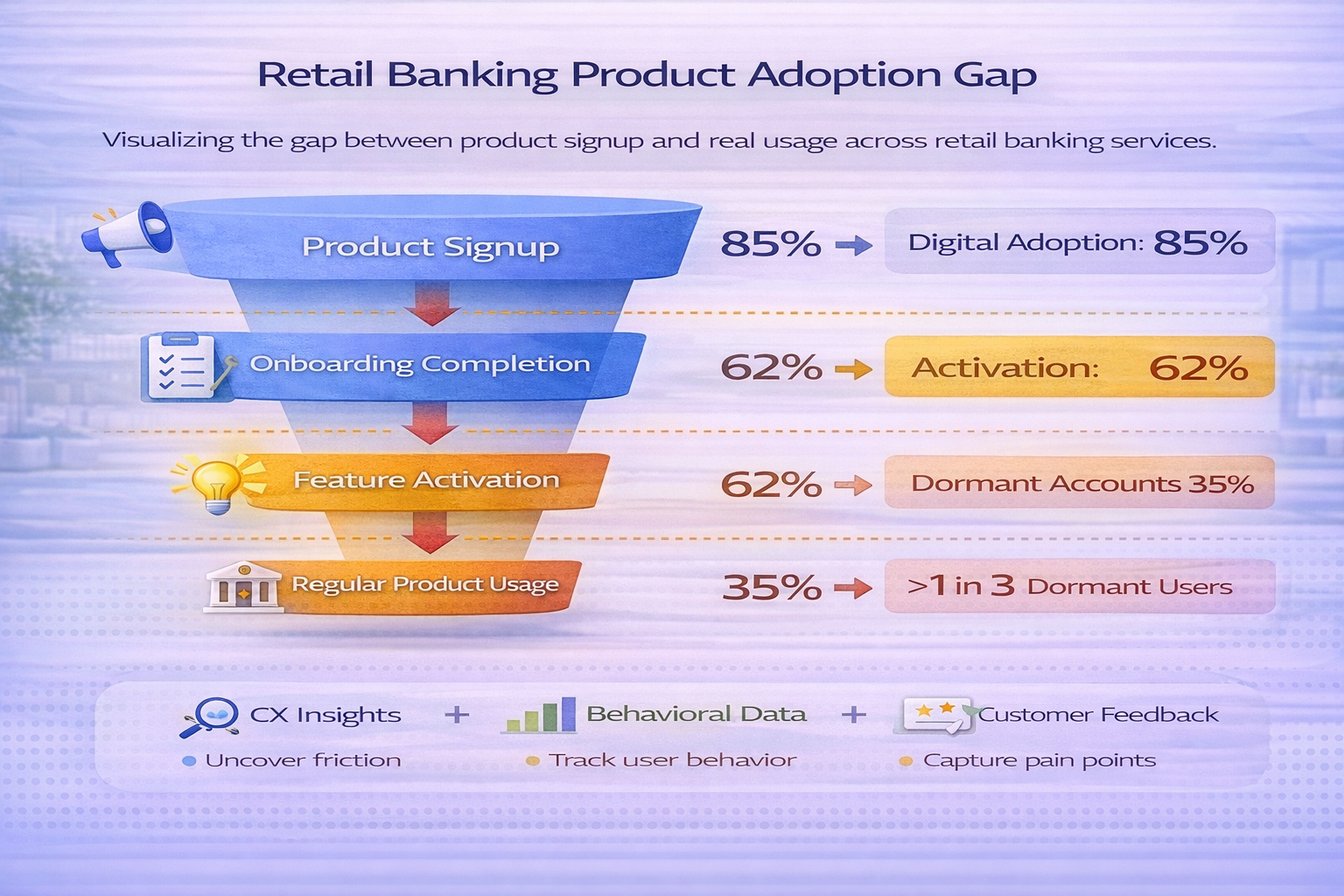 The product adoption gap refers to the difference between customers who sign up for a banking product and those who actively use it. Banks may see strong enrollment numbers, but many customers never perform meaningful actions such as transactions, feature activation, or ongoing engagement. Closing this gap is a major focus for modern retail CX strategies.