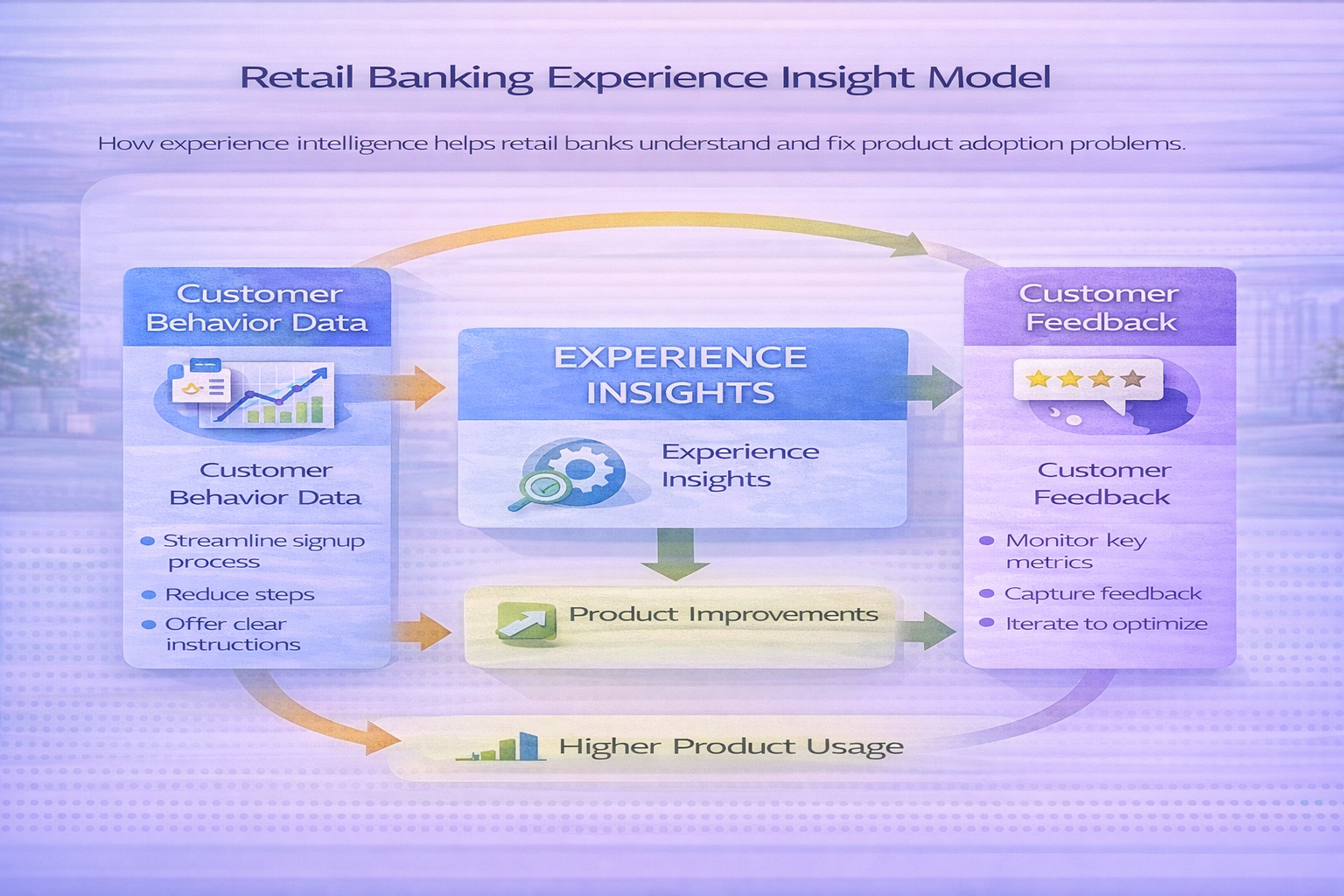 Experience intelligence refers to the process of combining behavioral data, journey analytics, and customer feedback to understand how customers interact with banking products. This approach helps banks identify engagement barriers and improve retail CX strategies.